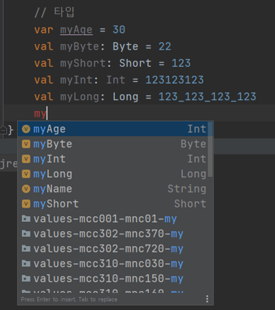또 한가지 팁으로 안드로이드 스튜디오 자동완성에서보면 변수에 동그라미와 네모로 구분이 되는데